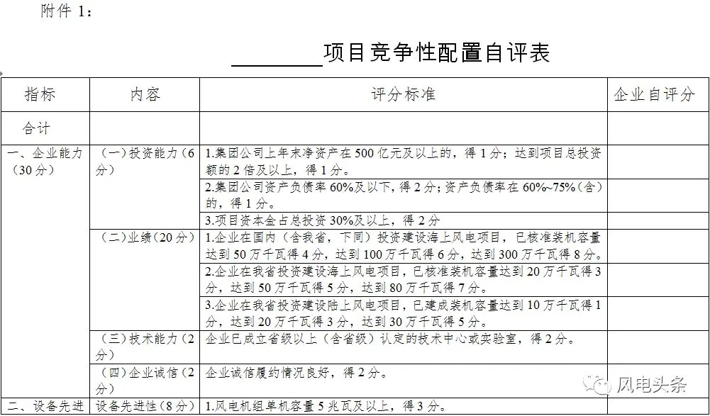 配置范圍:原則上應納入省陸上風電發展規劃,并完成一年以上測風的集中式陸上風電項目。通過綜合評分排序,確定投資主體、建設規模和上網電價。